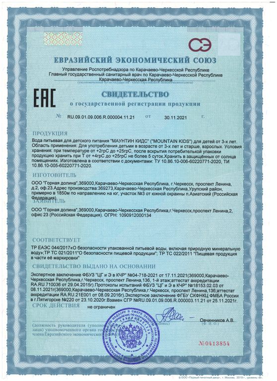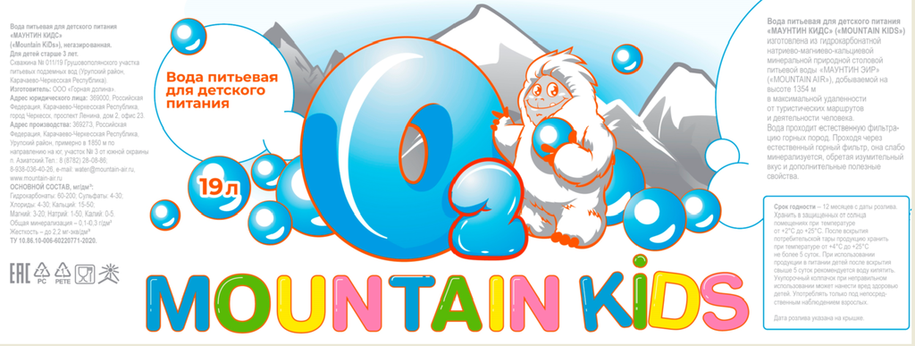 Питьевая вода "Mountain Kids" не имеет аналогов в России и рекомендована для детского питания. В соответствии с требованиями ТР ЕАЭС 044/2017, что подтверждено экспертным заключением ФГБУН «ФИЦ питания биологии питания и биотехнологии» в г. Москва.
