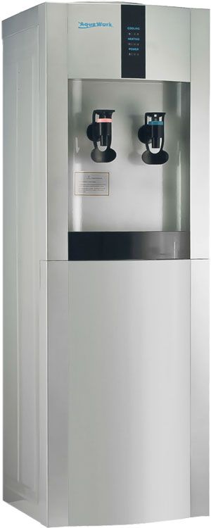 Диспенсер оснащен простой термоэлектронной системой охлаждения с невысокими показателями: 0,6-0,8 литра в течении часа на 12-15 градусов ниже температуры окружающей среды. Этого хватает зимой или в межсезонье, но жарким летом аппарат сможет за час произвести только несколько (3-4) стакана прохладной воды. Если Вам требуется по-настоящему холодная влага, обратите внимание на точно такую же модель, но оснащенную компрессорным блоком - Aqua Work 16-L/EN.